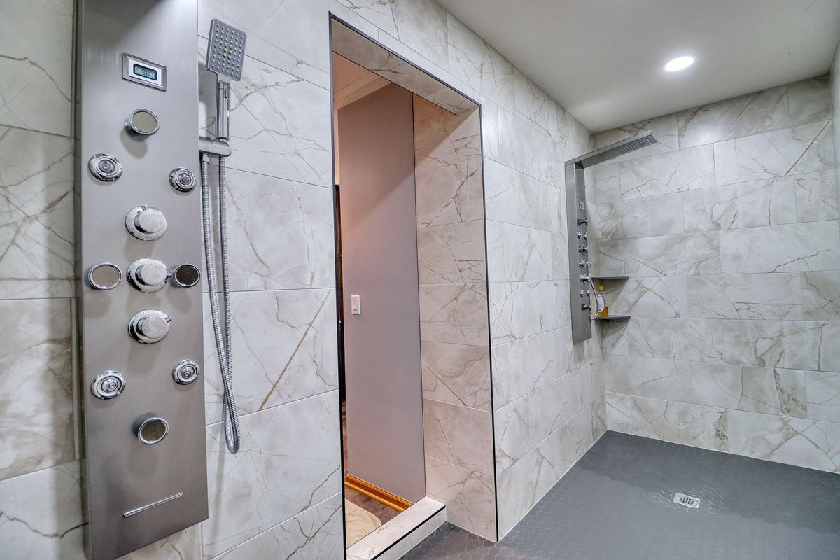 Modern accessible shower with gray floor, tiled walls, and silver shower fixtures.