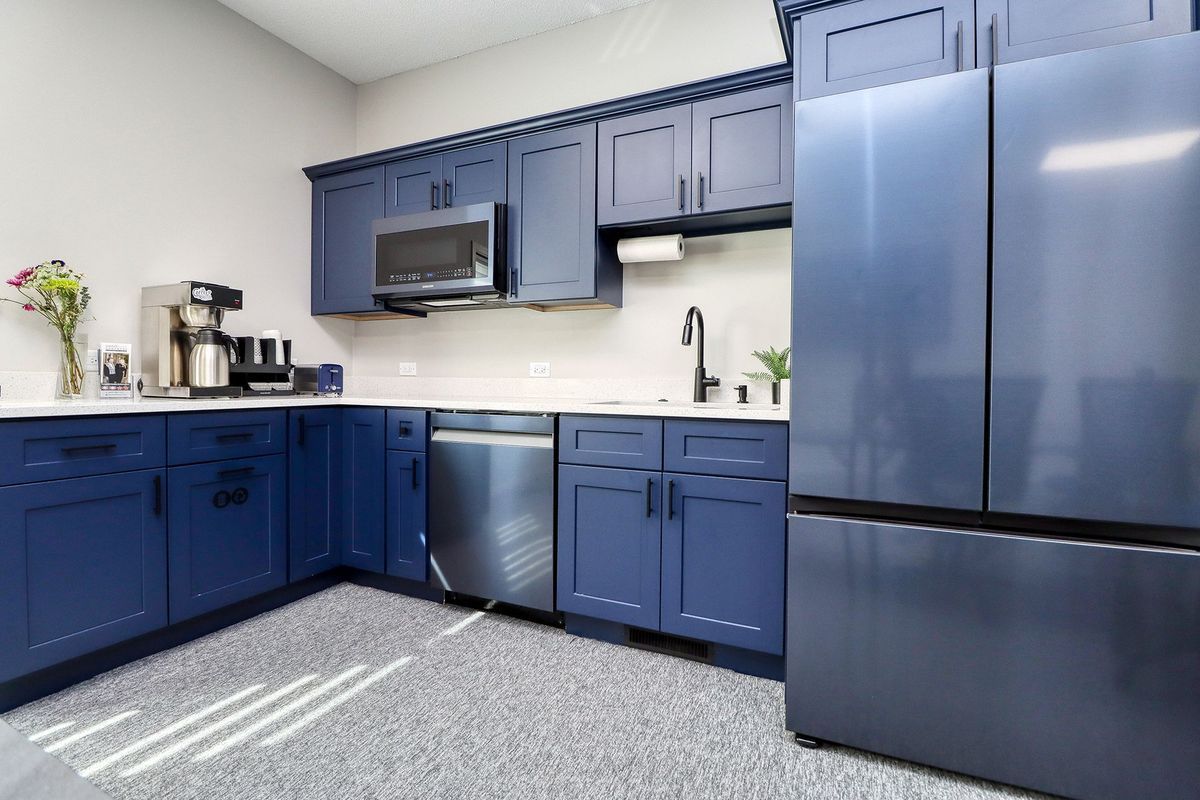 Modern kitchen with gray cabinets, island with stools, stainless steel appliances, and wood door.