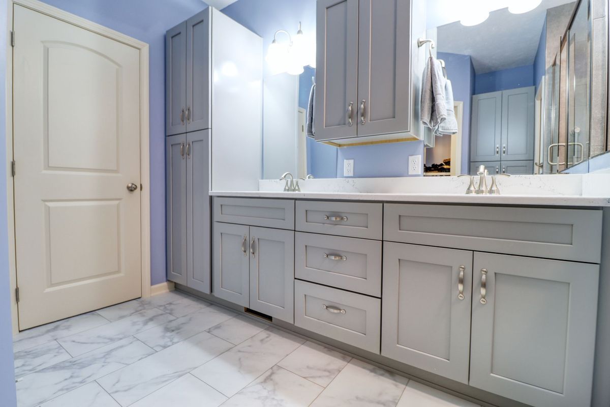 Bathroom with double doors, vanity with two sinks, and a tall cabinet. Light wood tones and white countertops.
