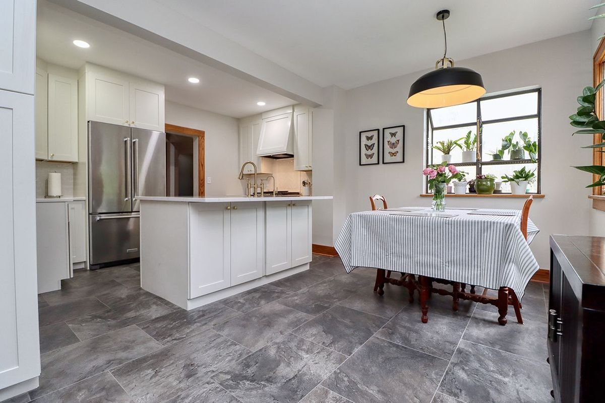 White kitchen with island, stainless steel appliances, and dining table set near window with plants.