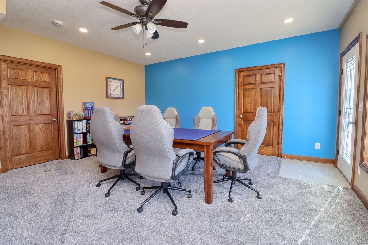 Cozy home library with built-in bookshelves, fireplace, two black chairs, and a ladder.